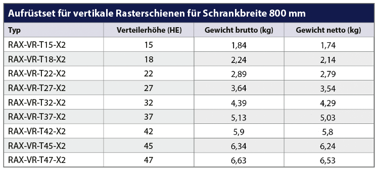 Aufrüstset für die vertikalen Rasterschienen RAX-VR-Txx-X2 in 800 mm breiten Verteilern, geschlossenes Profil aus 1 mm starkem Material (4 St.). Die Tragkraft des Schrankes erhöht sich auf 1500 kg.