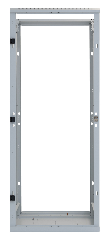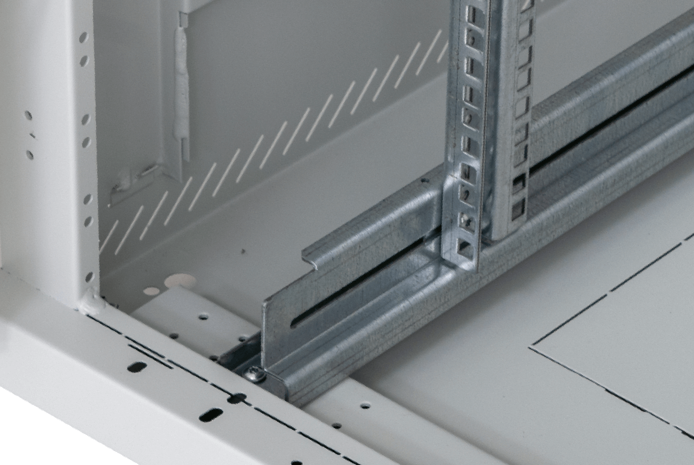 Die vertikalen 19“-Rasterschienen sind in der Schranktiefe stufenlos verstellbar. Dies erleichtert den Einbau der Komponenten sowie das Kabelmanagement.