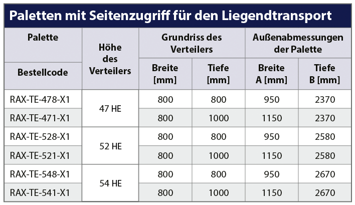 Alle RMA-Verteiler 800 mm breit und 800 und 1000 mm tief können ab einer Höhe von 47 HE optional auf einer Palette vom Typ RAX-TE-xxx-X1 liegend geliefert werden. Diese Paletten müssen gesondert ja nach Verteilertyp bestellt werden.