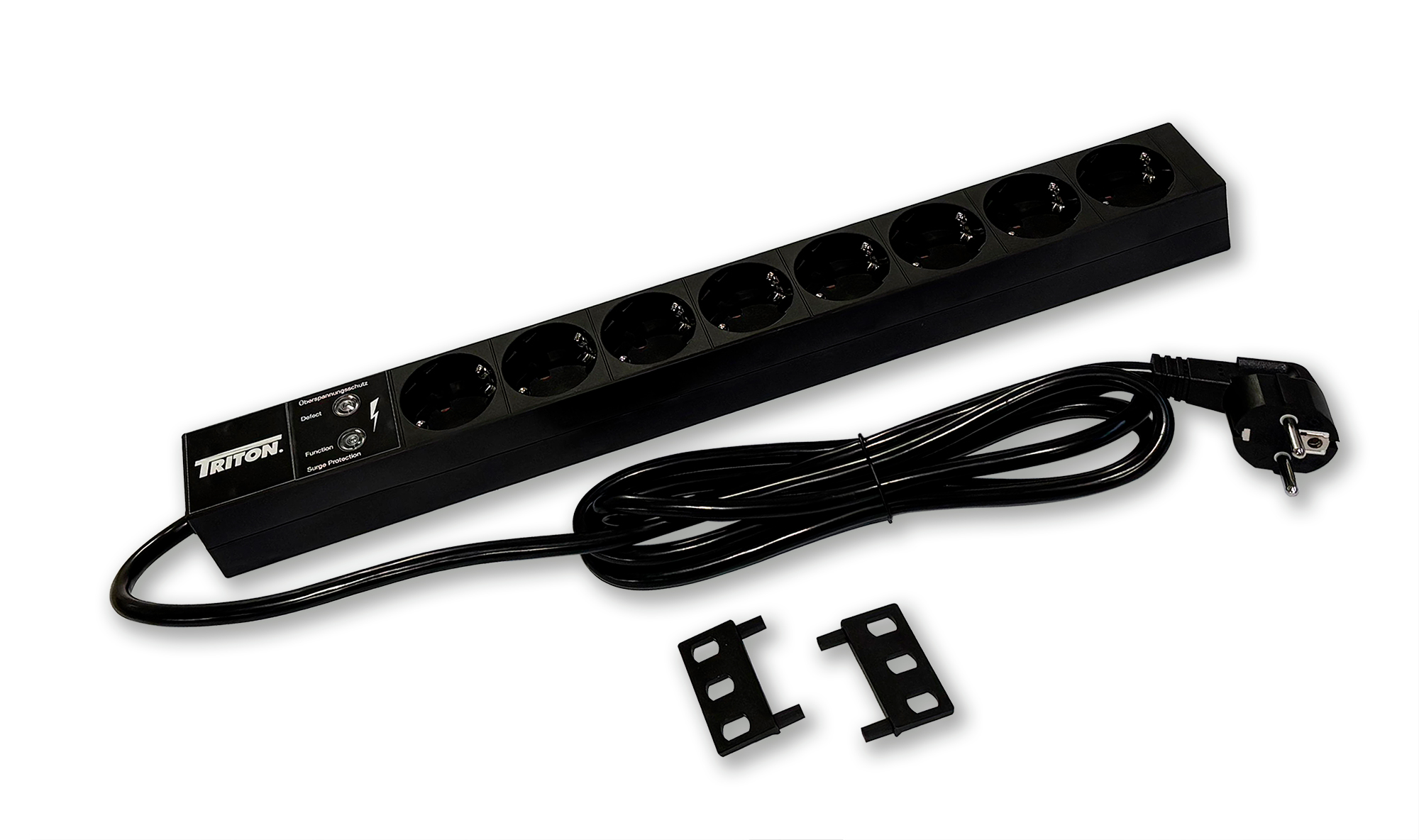 19″-Steckdosenleiste 1 HE, 8x CEE 7/3 (Typ F), 16 A / 250 V, 50 Hz, Kabel 2,0m, Überspannungsschutz, RAL 9005.