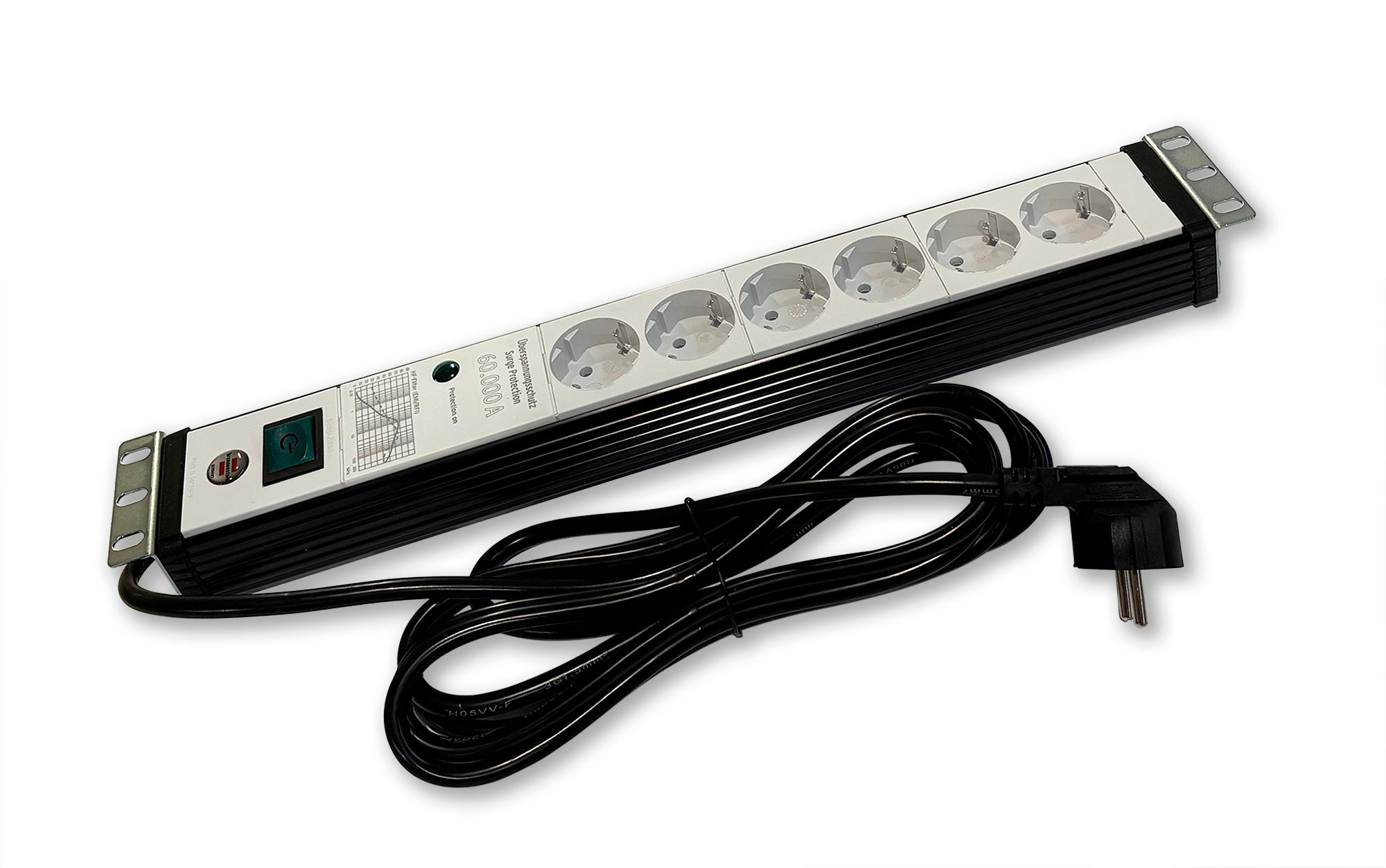 19“-7fach-Steckdosenleiste 1 HE, laut DIN, max. 16 A; Kabel 3 x 1,5 mm, 2 m + Universalstecker CZ-DE max. 16 A; Blitzschutzsicherung; beleuchteter Schalter mit Abdeckung; RAL 9005.